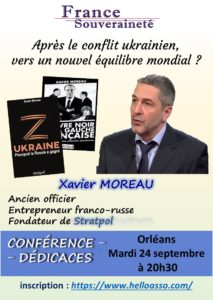 « Après le conflit ukrainien, vers un nouvel équilibre international ? avec Xavier Moreau. Mardi 24 septembre 20H30 à Orléans, conférence-dédicace
